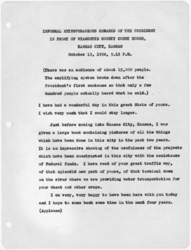 | Keywords: Extemporaneous remarks in front of Wyandotte County Court House, Kansas City, KS. - NARA - 197637.jpg Scope and content General notes 197637 Local identifier President 1933-1945 Roosevelt 1933 - 1945 NARA-Author Roosevelt Franklin D Franklin Delano 1882-1945 Author 1301590 <br /> Franklin D Roosevelt Library NLFDR 4079 Albany Post Road Hyde Park NY 12538-1999 1936-10-13 Record group Collection FDR-PPF Papers as President President's Personal File 1933 - 1945 Record group ARC 1185 Speeches of President Franklin D Roosevelt compiled 1933 - 1945 Series ARC 197300 File unit First Carbon Files 1933 - 1945 File unit ARC 197301 Variant control numbers NAIL Control Number NLR-PPF-1820-1STCARBON-SC89 Other versions <gallery> File Extemporaneous_remarks_in_front_of_Wyandotte_County_Court_House _Kansas_City _KS _-_NARA_-_197637 tif tif File Extemporaneous_remarks_in_front_of_Wyandotte_County_Court_House _Kansas_City _KS _-_NARA_-_197637 jpg jpg </gallery> NARA-cooperation PD-USGov Speeches by Franklin Delano Roosevelt Wyandotte County Courthouse Kansas City Kansas Kansas in the 1930s October 1936 1936 in the United States |