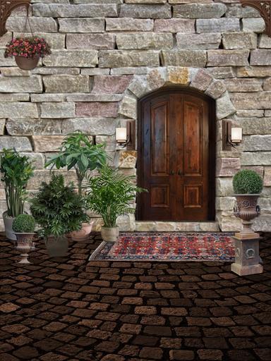 Keywords: exterior building stone door plants garden pavement cobblestones bricks arch wood containers planter planters background backdrop rustic historic