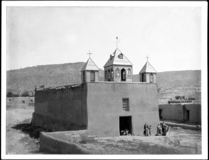 | Keywords: Exterior view of a church at Cibolleta, New Mexico, ca.1898 (CHS-4557).jpg en <br> Exterior view of a church at Cibolleta New Mexico ca 1898 Photograph of an exterior view of a church at Cibolleta New Mexico ca 1898 The large rectangular building sports three wooden bell towers -- two smaller ones flanking a larger central one -- over the main entry overlooking the walled graveyard Each tower is topped with a cross Five people possibly one or two families stand in the graveyard near the open entry in which a few more people can be seen in the shadows Picket fences and crosses mark three graves in the foreground A few other smaller buildings can be seen behind and to the right A hill rises in the background Call number CHS-4557 Photographer James George Wharton Filename CHS-4557 Coverage date circa 1898 Part of collection California Historical Society Collection 1860-1960 Type images Geographic subject city or populated place Cibolleta; San Jose Repository name USC Libraries Special Collections Accession number 4557 Microfiche number 1-179- Archival file chs_Volume96/CHS-4557 tiff Part of subcollection Title Insurance and Trust and C C Pierce Photography Collection 1860-1960 Repository address Doheny Memorial Library Los Angeles CA 90089-0189 Geographic subject country USA Format aacr2 3 photographs transparency photoprints b w ; 20 x 25 cm 21 x 26 cm Rights Digitally reproduced by the USC Digital Library; From the California Historical Society Collection at the University of Southern California Subject adlf religious facilities Project USC Repository email specol usc edu Identifying number unidentified no James-1436 Contributing entity California Historical Society Date created circa 1898 Publisher of the digital version University of Southern California Libraries Format aat transparencies; photographic prints; photographs Geographic subject state New Mexico Legacy record ID chs-m16891; USC-1-1-1-13971 Access conditions Send requests to address or e-mail given Phone 213 821-2366; fax 213 740-2343 Subject file heading Indians -- Pueblo -- Pueblo villages New Mexico Subject lcsh Indians of North America Subject Pueblo Indians; Pueblos of New Mexico circa 1898 date created George Wharton James 1858 1923 http //digitallibrary usc edu/cdm/ref/collection/p15799coll65/id/16813 PD-old-70-1923 Images from USC Digital Library uploaded by Fæ Photographs by George Wharton James California Historical Society Collection 1860-1960 |