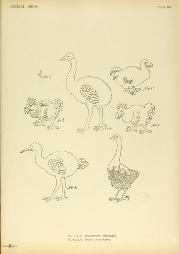 | Keywords: Extinctbirds1907 P25B Didus solitarius0341.png en The Rodrigues Solitaire Pezophaps solitaria and the Réunion Solitaire Raphus solitarius Réunion Sacred Ibis or Réunion Flightless Ibis Threskiornis solitarius Fig 1 Outline of figure in Leguat's Voyage 1708 Fig 2 Outline of Schlegel's reconstructed figure of the Solitaire 1854 Fig 3 Outline of Solitaire in Frontispiece to Leguat's Voyage 1708 Fig 4 Outline of Dr H Schlegel's reconstruction of the Reunion Dodo Fig 5 Outline of figure of White Dodo in the picture by Pieter Witthoos circa 1670 vide supra Fig 7 Outline of figure of White Dodo in an edition of Plinius Secundus about 1643 but without date Fig 8 Outline of Woodcut in Zaagman's edition of Bontekoe van Hoorn 1646 Extinct birds an attempt to unite in one volume a short account of those birds which have become extinct in historical times that is within the last six or seven hundred years to which are added a few which still exist but are on the verge of extinction By Lionel Walter Rothschild 2nd Baron Rothschild 8 February 1868 “ 27 August 1937 http //www archive org/details/extinctbirdsatte00roth Unknown Book Lionel Walter Rothschild 1907 Not in copyright Public Domain Original PD-old Extinct Birds Rothschild book 25b Threskiornis solitarius Pezophaps solitaria Raphus cucullatus in art |