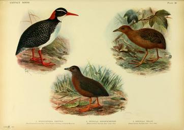 | Keywords: Extinctbirds1907 P26 Hypotaenidia pacifica0343.png en The Tahitian Red-billed Rail Gallirallus pacificus synonym Hypotaenidia pacifica or Tahiti Rail is a poorly-known extinct species of rail It once occurred on Tahiti The other two birds are Hawaiian Rail Porzana sandwichensis synonyms Pennula sandwichensis Pennula millsi Hawaiian Spotted Rail or Hawaiian Crake was a somewhat enigmatic species of diminutive rail that lived on Big Island HawaiĘ»i but is now extinct Extinct birds an attempt to unite in one volume a short account of those birds which have become extinct in historical times that is within the last six or seven hundred years to which are added a few which still exist but are on the verge of extinction By Lionel Walter Rothschild 2nd Baron Rothschild 8 February 1868 “ 27 August 1937 http //www archive org/details/extinctbirdsatte00roth Creator John Gerrard Keulemans 1907 Not in copyright Public Domain Original PD-old-100 Extinct Birds Rothschild book 26 John Gerrard Keulemans Gallirallus pacificus Porzana sandwichensis Rallidae in art |
