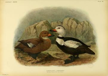 | Keywords: Extinctbirds1907 P36 Camptolaemus labradorius0363.png en The Labrador Duck Camptorhynchus labradorius was a striking black and white eider-like sea duck that was never known to be common and is believed to be the first bird to go extinct in North America after 1500 The last Labrador Duck is believed to have been seen at Elmira New York on December 12 1878; the last preserved specimen was shot in 1875 on Long Island It was thought to breed in Labrador although no nests were ever described and it wintered from Nova Scotia to as far south as Chesapeake Bay Extinct birds an attempt to unite in one volume a short account of those birds which have become extinct in historical times that is within the last six or seven hundred years to which are added a few which still exist but are on the verge of extinction By Lionel Walter Rothschild 2nd Baron Rothschild 8 February 1868 “ 27 August 1937 http //www archive org/details/extinctbirdsatte00roth Creator John Gerrard Keulemans 1907 Not in copyright Public Domain smaller edited version Original PD-old-100 Extinct Birds Rothschild book 36 John Gerrard Keulemans Camptorhynchus labradorius |