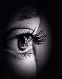 Keywords: eye pupil iris view eyelash see look behold make up cosmetics model beauty black and white female