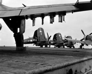 | Keywords: F4U-4s VMA-332 CVE-119 27Jul53.JPEG en Vought F4U-4 Corsair fighters assigned to U S Marine Corps attack squadron VMA-332 Polka-dots aboard the escort carrier USS Point Cruz CVE-119 on 27 July 1953 during a deployment to Korea <br>Official caption READYING FOR COMBAT - Planes of the Marine Polka Dot squadron await ordnance on the last day of the Korean War Corsair attack bombers flown by squadron pilots racked up an impressive record of destruction in the short time they took part in the Korean War U S www defenseimagery mil photo no HM-SN-98-06901 NARA file no 127-GK-1-A348757 photographer Cpl G R Corseri USMC 1953-07-27 PD-USGov F4U Corsairs in the Korean War F4U-4 Corsair USS Point Cruz CVE-119 Marine Fighter Attack Squadron 332 |