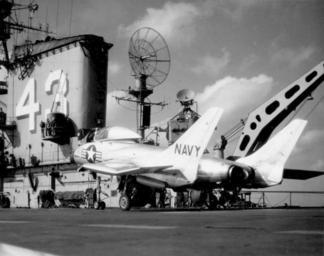 | Keywords: F7U-3 CVB-43 Nov1952.jpg A U S Navy Vought F7U-3 Cutlass during carrier qualifications aboard the aircraft carrier USS Coral Sea CVB-43 in November 1952 Note the SK-2 radar and the Mk 37 gun director with Mk 25 radar in the background www usscoralsea net http //www usscoralsea net/images/navycutlass1 jpg 1952-11 U S Navy PD-USGov-Military-Navy Vought F7U Cutlass Aboard USS Coral Sea CV-43 SK-2 radar | ||||