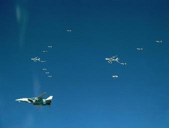 | Keywords: F-14A VF-33 Operation Desert Storm Strike Package Tanking.jpg en F/A-18 Hornet and A-6E Intruder aircraft from Carrier Air Wing 1 CVW-1 conduct an in-flight refueling with a pair of U S Air Force KC-135R Stratotanker aircraft while en route to their target during Operation Desert Storm A Fighter Squadron 33 VF-33 F-14A Tomcat aircraft also from CVW-1 is in the foreground CVW-1 is based aboard the aircraft carrier USS AMERICA CV 66 1991-01-01 www DefenseImagery mil US Navy PD-USGov Uploaded with UploadWizard Aircraft formation flight of F-14A Tomcat Aerial photographs of F-14 Tomcat in flight KC-135R Stratotanker Fighter Squadron 33 United States Navy Gulf War 1990-1991 A-6E Intruder |