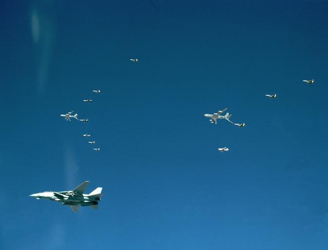 Keywords: F-14A VF-33 Operation Desert Storm Strike Package Tanking.jpg en F/A-18 Hornet and A-6E Intruder aircraft from Carrier Air Wing 1 CVW-1 conduct an in-flight refueling with a pair of U S Air Force KC-135R Stratotanker aircraft while en route to their target during Operation Desert Storm A Fighter Squadron 33 VF-33 F-14A Tomcat aircraft also from CVW-1 is in the foreground CVW-1 is based aboard the aircraft carrier USS AMERICA CV 66 1991-01-01 www DefenseImagery mil US Navy PD-USGov Uploaded with UploadWizard Aircraft formation flight of F-14A Tomcat Aerial photographs of F-14 Tomcat in flight KC-135R Stratotanker Fighter Squadron 33 United States Navy Gulf War 1990-1991 A-6E Intruder |