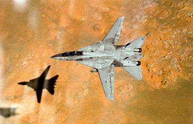 Keywords: F-14A VF-41 over the Saudi desert 1991.JPEG Preceded by its shadow a U S Navy Grumman F-14A Tomcat aircraft from Fighter Squadron VF-41 Black Aces passes over western Saudi Arabia during low-altitude training VF-41 was assigend to Carrier Air Wing 8 CVW-8 aboard the aircraft carrier USS Theodore Roosevelt CVN-71 for a deployment to the Persian Gulf area from 28 December 1990 to 28 June 1991 http //www defenseimagery mil U S DefenseImagery photo VIRIN http //www defenseimagery mil/imagery html guid eaa0b3372892463d4c2201279b4a9c776f460fec DN-SC-92-04260 1991-04-01 Lt Gerald B Parsons USN PD-USGov-Military-Navy F-14A Tomcat in flight Aerial photographs of F-14 Tomcat in flight Fighter Squadron 41 United States Navy Shadows of aircraft