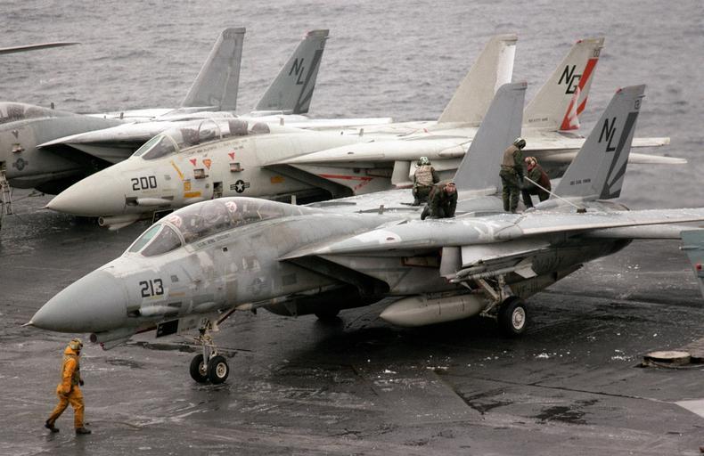 | Keywords: F-14As VF-111 on USS Carl Vinson (CVN-70) 1987.JPEG A U S Navy aircraft handling crewmen brush snow and ice off the wings of Grumman F-14A Tomcat aircraft BuNos 160660 160668 161153 of Fighter Squadron VF-111 Sundowners during flight operations aboard the aircraft carrier USS Carl Vinson CVN-70 in 1987 VF-111 was assigned to Carrier Air Wing 15 CVW-15 aboard the Carl Vinson for a deployment to the Western Pacific and the Indian Ocean from 12 August 1986 to 5 February 1987 Note the lighter camouflage of the F-14A 160660 200 which wears the tail code NG of CVW-9 and the name of CVW-9's then parent carrier USS Kitty Hawk CV-63 The rudders however show the markings of VF-111 http //www defenseimagery mil U S DefenseImagery photo VIRIN http //www dodmedia osd mil/DVIC_View/Still_Details cfm SDAN DNSC8706456 JPGPath /Assets/1986/Navy/DN-SC-87-06456 JPG DN-SC-87-06456 1987-01-21 PH3 Butler USN PD-USGov-Military-Navy F-14A Tomcat on flight decks Fighter Squadron 111 United States Navy USS Carl Vinson CVN-70 flight deck Military aircraft in snow |