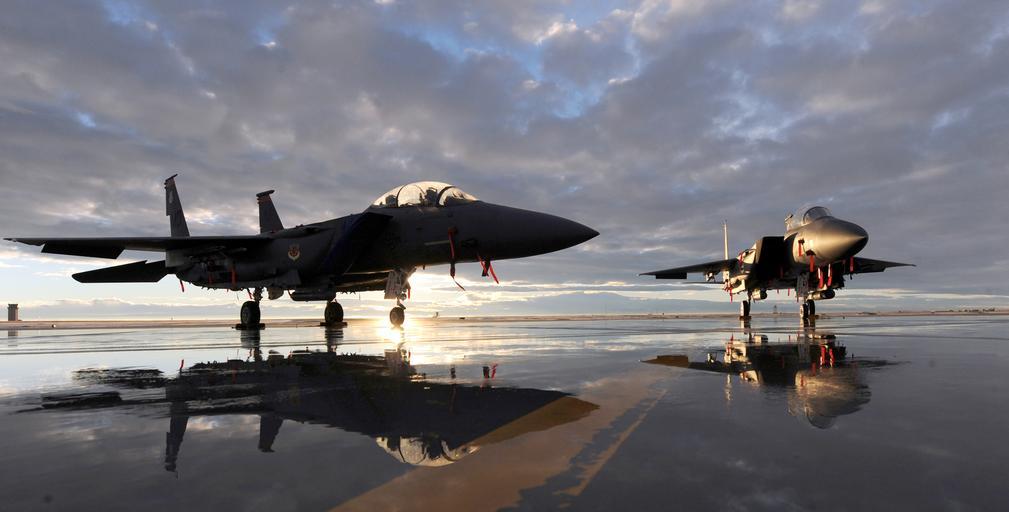| Keywords: F-15E Strike Eagles.jpg en Two F-15E Strike Eagles sit on the flightline during sunset Dec 6 2010 at Mountain Home Air Force Base Idaho The F-15E is a dual-role fighter designed to perform air-to-air and air-to-ground missions An array of avionics and electronics systems gives the F-15E the capability to fight at low altitude day or night and in all weather The F-15Es are assigned to the 391st and 389th Fighter Squadrons 2010-12-06 http //pdphoto org/PictureDetail php mat pg 5957 U S Air Force photo/Senior Airman Debbie Lockhart Custom license marker 2012 02 12 http //www pdphoto org PD Photo org Uploaded with UploadWizard F-15E Strike Eagle |