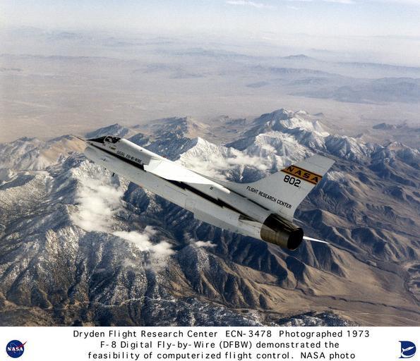 | Keywords: F-8 Digital Fly-by-Wire (DFBW) in flight over snow capped mountains DVIDS692994.jpg en F-8 Digital Fly-by-Wire DFBW aircraft in flight over snow capped mountains Externally identical to a standard Navy F-8C this aircraft had its control system replaced initially by a primary system using an Apollo digital computer The backup system used three analog computers When the pilot moved the airplane's stick and rudder electronic signals went to the computer which would generate signals to move the control surfaces The system was designed so that the digital fly-by-wire aircraft would handle almost identically to a standard F-8C Later in Phase 2 the aircraft used three IBM AP-101 computers for its flight control system The F-8 Digital Fly-By-Wire DFBW flight research project validated the principal concepts of all-electric flight control systems now used on nearly all modern high-performance aircraft and on military and civilian transports The first flight of the 13-year project was on May 25 1972 with research pilot Gary E Krier at the controls of a modified F-8C Crusader that served as the testbed for the fly-by-wire technologies The project was a joint effort between the NASA Flight Research Center Edwards California now the Dryden Flight Research Center and Langley Research Center It included a total of 211 flights The last flight was December 16 1985 with Dryden research pilot Ed Schneider at the controls The F-8 DFBW system was the forerunner of current fly-by-wire systems used in the space shuttles and on today's military and civil aircraft to make them safer more maneuverable and more efficient Electronic fly-by-wire systems replaced older hydraulic control systems freeing designers to design aircraft with reduced in-flight stability Fly-by-wire systems are safer because of their redundancies They are more maneuverable because computers can command more frequent adjustments than a human pilot can For airliners computerized control ensures a smoother ride than a human pilot alone can provide Digital-fly-by-wire is more efficient because it is lighter and takes up less space than the hydraulic systems it replaced This either reduces the fuel required to fly or increases the number of passengers or pounds of cargo the aircraft can carry Digital fly-by-wire is currently used in a variety of aircraft ranging from F/A-18 fighters to the Boeing 777 The DFBW research program is considered one of the most significant and most successful NASA aeronautical programs since the inception of the agency F-8 aircraft were built originally for the U S Navy by LTV Aerospace of Dallas Texas The aircraft had a wingspan of 35 feet 2 inches; was 54 feet 6 inches long; and was powered by a Pratt Whitney J57 turbojet engine NASA Identifier NIX-ECN-3478 2009-09-23 Glenn Research Center https //www dvidshub net/image/692994 692994 2012-10-10 12 57 WASHINGTON DC US PD-USGov Langley Research Center Images from DoD uploaded by Fæ |