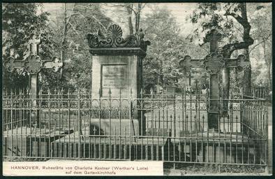 | Keywords: F. Astholz jun. AK 0756 Hannover, Ruhestätte von Charlotte Kestner (Werther's Lotte) auf dem Gartenkirchhofe, Bildseite Einfriedung Maria Ernestine Charlotte Laves, Georg Wilhelm Carl Theodor Kestner.jpg Im Lichtdruck-Verfahren reproduzierte Aufnahme als fortlaufend nummerierte Ansichtskarte Nummer 756 von Friedrich Astholz junior siehe die Rückseite der Postkarte Zu sehen ist eine Frontal-Ansicht um 1900 mit dem Grabmal von Charlotte Kestner in der Bildmitte eingerahmt von den eisernen Grabkreuzen ihrer Urenkelin Maria Ernestine Charlotte Laves links und ihres Enkels Georg Wilhelm Carl Theodor Kestner Auditor bey Königl Justizkanzlei Hannover Die Grabstätten sind hier noch mit einem heute nicht mehr vorhandenen Eisenzaun umfriedet Im Hintergrund sind weitere Grabkreuze zu erkennen sowie eine auf einer Parkbank sitzende Dame Dieses Dokument wurde freundlicherweise von Heralde Schmitt-Ulms zum Scannen geliehen um es als Digitalisat bei Commons nachhaltig allen Menschen zu Bildungszwecken zur Verfügung zu stellen Scan vom Original Bernd Schwabe in Hannover ~ 1900 Friedrich Astholz junior <gallery> File F Astholz jun AK 0756 Hannover Ruhestätte von Charlotte Kestner Werther's Lotte auf dem Gartenkirchhofe Adresseite der Postkarte sogenannte geteilte Rückseite jpg Adressseite sogenannte geteilte Rückseite der fortlaufend nummerierten Ansichtskarte Nr 756 mit Verlagsangaben </gallery> PD-old Documents by Heralde Schmitt-Ulms Friedrich Astholz junior Grabmal Charlotte Kestner Georg Ludwig Friedrich Laves |