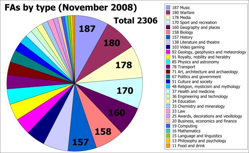 | Keywords: FA articles 2008-11-16 pie.svg  contains the raw data Related charts are w Image FA stats by type February 2008 piechart gif and w Image FA stats by type February 2008 barchart gif Data is from w Wikipedia Featured articles retrieved on 2008-11-16 15 30 UTC Gnumeric 1 9 1 was used to create this chart There are 2306 FA articles per http //en wikipedia org/w/index php title Wikipedia Featured_articles oldid 252076351 2008-11-16 84user See also thumb left same data as a bar chart ordered by number thumb center same data with sections ordered alphabetically clr w Image FA stats by type February 2008 piechart gif w Image FA stats by type February 2008 barchart gif contains the raw data that was used to make these charts Created with Gnumeric SVG statistics Wikipedia statistics English Wikipedia statistics |