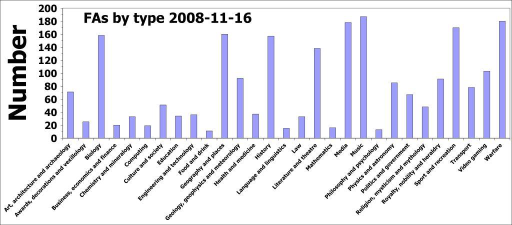 | Keywords: FA articles 2008-11-16 bar alphabetical.svg  contains the raw data Related charts are w Image FA stats by type February 2008 piechart gif and w Image FA stats by type February 2008 barchart gif Data is from w Wikipedia Featured articles retrieved on 2008-11-16 15 30 UTC Gnumeric 1 9 1 was used to create this chart 2008-11-16 84user See also thumb left same data ordered by number thumb center same data as a pie chart clr w Image FA stats by type February 2008 piechart gif w Image FA stats by type February 2008 barchart gif contains the raw data that was used to make these charts Created with Gnumeric SVG statistics Wikipedia statistics English Wikipedia statistics |