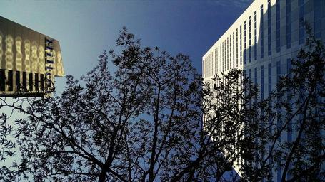 Keywords: facades buildings architecture modern exterior construction urban house structure design new skyscraper wall front perspective contemporary towers tree between high up branches hilton hotel