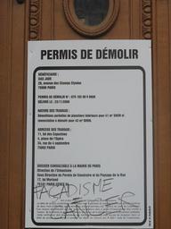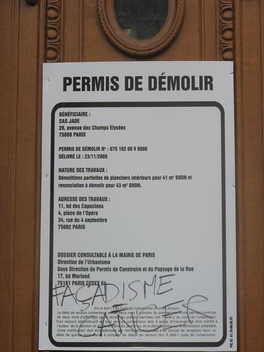 | Keywords: Facadisme=Cancer.jpg en Poster of demolition licence tagged with a graffiti against facadism Facadisme cancer on a building with works in progress on the place de l'Opéra Paris 2nd arr fr Affiche de permis de demolir surchargée par un graffiti contre le façadisme Facadisme cancer sur un immeuble en travaux de la place de l'Opéra Paris 2e arr own Tangopaso 2010-05-17 Commons Tangopaso Facadism in France Graffiti in Paris Demonstrations and protests in Île-de-France Boulevard des Capucines Paris Place de l'Opéra Paris Rue du Quatre-Septembre Paris Permits Non-free graffiti |