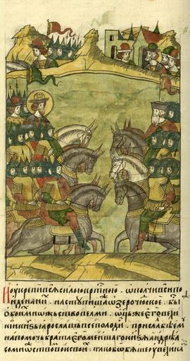 | Keywords: Facial Chronicle - b.06, p.084 - Battle of the Ice.jpg Schlacht auf dem Peipussee unmittelbar vor der Schlacht en Alexander Nevskiy ice battle ru Ледовое побоище И ук епил Александ всех силой к естной и подняв всех за собой пошел на немцев Пот яслось же озе о Чудское было же обоих войск множество большое Отец же Александ а великий князь Я ослав Всеволодович п ислал ему на помощь б ата Александ ова меньшего князя Анд ея с множеством воинов своих; так что было у великого князя Александ а множество х аб ых воинов как некогда у ца я Давида были воины сильные и к епкие И воины великого князя Александ а исполнились духом воинским; были же се дца их как у львов И сказали воины «О князь наш почтенный и до огой тепе ь п ишло в емя нам положить головы свои за тебя» Великий же князь Александ поднял уки свои к ебу и сказал «Суди Боже и ассуди спо мой; от на ода го деливого помоги Господи как некогда оисею помог одолеть Амали ка и п едку моему князю Я ославу окаян ного Святополка» http //www akteon-elib ru/LITsIeVOI-LIeTOPISNYI-SVOD-Russkaya-letopisnaya-istoriya-Kniga-6/ 20 unbekannt unknown неизвестен 16 Jh 16th centry 16 века PD-Art Alexander Nevsky in miniature Facial Chronicle v 5 - Laptevskiy tom 1116-1252 Files uploaded by Shakko from various sources Battle of the Ice |