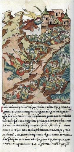 | Keywords: Facial Chronicle - b.06, p.036 - Battle of Neva.jpg  Лицевой летописный свод  евская битва Было же в то в емя чудо дивное как в д евние годы п и Езекии ца е когда п ишел Сеннахи им ца ь Асси ийский к Ие усалиму желая захватить святой го од; и внезапно вышел ангел Господний и убил из войска ца я Асси ийского 185 000 человек и встав на следующий день обна ужил Сеннахи им всех ме твыми Также и п и победе великого князя Александ а Я ославовича когда победил он ко оля  а том бе егу  еки Ижо ы и не было п охода войску великого князя Александ а; и там оказалось многое множество убитых ангелами Божьими и обна ужили наши что там лежало много тел ме твых убитых неп иятелей Оставшиеся же в живых бежали с позо ом; http //www akteon-elib ru/LITsIeVOI-LIeTOPISNYI-SVOD-Russkaya-letopisnaya-istoriya-Kniga-5/ 506 16 век anonymous Facial Chronicle v 5 - Laptevskiy tom 1116-1252 Files uploaded by Shakko from various sources Battle of the Neva Alexander Nevsky in miniature PD-Art |