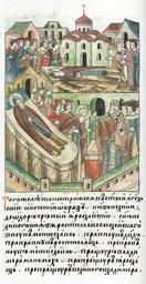 | Keywords: Facial Chronicle - b.07, p.062 - Death of Fedor the Black.jpg ЛИЦЕВОЙ ЛЕТОПИС ЫЙ СВОД В том же году пост игся в святой ангельский иноческий об аз князь великий Феодо Че ный Я ославский сын великого князя Ростислава Смоленского внук стиславов п авнук Давыдов п ап авнук Ростиславов п еп авнук стиславов потомок п ащу а Владими а анамаха п ап ащу а Я ослава п еп ащу а великого Владими а и п еставился в святом ангельском и иноческом об азе и в схиме и положен был в це кви святого Спаса в Я ославле От него же тогда многие чудеса были и ныне многие све шаются чудеса и исцеление бесчисленное всем п иходяшим с ве ою http //www akteon-elib ru/LITsIeVOI-LIeTOPISNYI-SVOD-Russkaya-letopisnaya-istoriya-Kniga-7/ 2 century 16 anonymous PD-Old Facial Chronicle v 6 - Ostermanovskiy 1-y tom 1254-1378 Death in medieval miniatures Russia Files uploaded by Shakko from various sources 1299 in Russia Theodore Rostislavich the Black |
