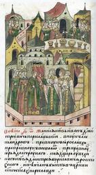 | Keywords: Facial Chronicle - b.07, p.012 - Wedding of Ivan Dmitrievich of Pereyaslavl.jpg ЛИЦЕВОЙ ЛЕТОПИС ЫЙ СВОД В 6800 году Женился князь Иван Дмит иевич Пе еславский внук Александ ов п авнук Я ославов п ап авнук Всеволодов п еп авнук Ю ия Долго укого взял дочь у великого князя Дмит ия Бо исовича Ростовского и венчан был в це кви святого Спаса в Пе еславле http //www akteon-elib ru/LITsIeVOI-LIeTOPISNYI-SVOD-Russkaya-letopisnaya-istoriya-Kniga-7/ 2 century 16 anonymous PD-Old Facial Chronicle v 6 - Ostermanovskiy 1-y tom 1254-1378 Files uploaded by Shakko from various sources Ivan Dmitrievich of Pereyaslavl Weddings in medieval manuscripts Russia 1292 in Russia Rurik Dynasty |