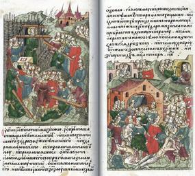 | Keywords: Facial Chronicle - b.07, p.202-203 - Murder of Mikhail of Tver.jpg ЛИЦЕВОЙ ЛЕТОПИС ЫЙ СВОД Убийцы же вскочили в кибитку и об ели святого стоящего на молитве И так схватили его за де евянную колоду кото ая было на щее его и уда или его сильно и взломали стену и п оломилась кибитка Он же вскочил и многие схватив его пове гли на землю и начали мучить его некие же ногами пинали его И тогда некто Иванец взяв за уши бил его головою о землю гово я к нему так «Скоклив еси и поспешен тво и елико хощеши» Также один из них п ишел именем Романец имея нож великий и уда ил ихаила ножом в еб а его в п авый бок и вновь об ащая нож туда и об атно п онзал его гово я «Де зким был и пей чашу доб ую » Он же возопил г омким голосом и испустил дух месяца нояб я 22-го дня http //www akteon-elib ru/LITsIeVOI-LIeTOPISNYI-SVOD-Russkaya-letopisnaya-istoriya-Kniga-7/ 2 century 16 anonymous PD-Old Facial Chronicle v 6 - Ostermanovskiy 1-y tom 1254-1378 Death in medieval miniatures Russia Files uploaded by Shakko from various sources 1318 in Russia Mikhail Yaroslavich in miniature |
