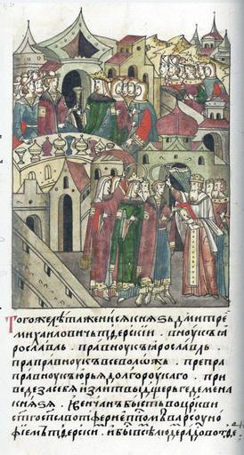 | Keywords: Facial Chronicle - b.07, p.218 - Wedding of Dmitry Mikhailovich and Maria Gediminovna.jpg  ЛИЦЕВОЙ ЛЕТОПИС ЫЙ СВОД В том же году женился князь Дмит ий  ихайлович Тве ской внук Я ославов п авнук Я ославов п ап авнук Всеволодов п еп ап авнук Ю ия Долго укого п ивел за себя из Литвы дочь Гедемина князя И венчан был в це кви святого Спаса в Тве и епископом Ва сонофием Тве ским и была всем людям  адость в Тве и http //www akteon-elib ru/LITsIeVOI-LIeTOPISNYI-SVOD-Russkaya-letopisnaya-istoriya-Kniga-7/ 2 century 16 anonymous PD-Old Facial Chronicle v 6 - Ostermanovskiy 1-y tom 1254-1378 Files uploaded by Shakko from various sources 1320 in Russia Weddings in medieval manuscripts Russia Dmitry Mikhailovich Maria of Lithuania 1348  |