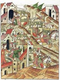 | Keywords: Facial Chronicle - b.08, p.421 - Algierd at Moscow.png en Retreat of Lithuanian forces of Algirdas from Moscow in 1370 Отступление Ольге да от осквы в 1370 году иниатю а Лицевого свода XVI в ЛИЦЕВОЙ ЛЕТОПИС ЫЙ СВОД Ольге д много завоевал сжег убил и захватил в плен и ешил идти об атно но узнав что соб алось большое войско и готовится к битве испугался и начал п осить ми а Князь великий Дмит ий Иванович заключил с ним ми до Пет ова дня но Ольге д хотел заключить ми навеки и ешил отдать за князя Владими а Анд еевича свою дочь что и п оизошло И заключив ми отошел князь от осквы п обыв под осквою восемь дней и ве нулся в свое княжество идя осто ожно ози аясь по сто онам опасаясь за собой погони Князь ихаил Александ ович ве нулся в Тве ь заключив ми с великим князем Дмит ием Ивановичем http //www akteon-elib ru/LITsIeVOI-LIeTOPISNYI-SVOD-Russkaya-letopisnaya-istoriya-Kniga-8/ 424 anonymous century 16 PD-old thumb 100px left full page thumb 100px left graystyle PD-Art Algirdas 1 History of Moscow Facial Chronicle v 6 - Ostermanovskiy 1-y tom 1254-1378 1370 in Russia Dmitry Donskoy in manuscripts |