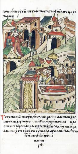| Keywords: Facial Chronicle - b.08, p.187 - Death of Alexander Mikhailovich of Tver (1357).jpg ЛИЦЕВОЙ ЛЕТОПИС ЫЙ СВОД В том же году у князя ихаила Александ овича Тве ского п авнука Я ославова п еставился сын князь Александ у жены своей у великой княгини Софьи в Софийском монасты е http //www akteon-elib ru/LITsIeVOI-LIeTOPISNYI-SVOD-Russkaya-letopisnaya-istoriya-Kniga-8/ VI century 16 anonymous PD-Old Facial Chronicle v 6 - Ostermanovskiy 1-y tom 1254-1378 Death in medieval miniatures Russia Files uploaded by Shakko from various sources 1357 in Russia Princes of Tver |