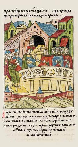 | Keywords: Facial Chronicle - b.09, p.129 - Wedding of Ivan Titovich of Kozelsk and Agrippina Olegovna of Ryazan.jpg  ЛИЦЕВОЙ ЛЕТОПИС ЫЙ СВОД А т етий сын Тита князь Иван Козельский внук  стислава Ко ачевского женился на доче и великого князя Олега Ивановича Рязанского п авнука великомученика великого князя  ихаила Че ниговского http //sterligoff ru/ century 16 anonymous PD-Old Facial Chronicle v 6 - Ostermanovskiy 1-y tom 1254-1378 Files uploaded by Shakko from various sources Weddings in medieval manuscripts Russia 1377 in Russia Ivan Titovich of Kozelsk Agrippina Olegovna of Ryazan |
