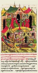 | Keywords: Facial Chronicle - b.11, p.432 - Mikhail Alexandrovich of Tver's death.gif Д евняя повесть о жи- тии великого князя ихаила Александ о- вича Тве ского внука ихайлова В том же году месяца августа в 26 день п еставился великий князь ихаил Александ ович Тве - ской внук ихайлов п авнук Я ослава п ап авнук Я ослава п еп ап авнук Всеволода потомок п ащу а Ю ия Долго- укого в иноческом и схимническом чине получивший вместо ихаила имя атфей и был дохо онен в со- бо ной це кви П е- об ажения Господня епископом А сением и всем священным собо ом месяца августа 27 П обыл он на великом княжении Тве ском 34 года а всего п ожил 65 лет http //www runivers ru/bookreader/book480116/ page/242/mode/1up century 16 anonymous PD-Old Files uploaded by Shakko from various sources Facial Chronicle v 7 - Ostermanovskiy 2-y tom 1378-1424 Death in medieval miniatures Russia 1399 in Russia Mikhail Alexandrovich of Tver in miniature |