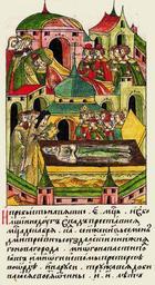 | Keywords: Facial Chronicle - b.11, p.528 - Semen Dmitrievich of Suzdal's death.gif И п обыл в Вят- ке 5 месяцев и еще больше азболевшись п еста- вился месяца декаб я в 21 день Этот князь Семен Дмит иевич Суздальский и ижне- го овго ода пе ежил много напастей и бед в О де и на Руси т удился ст емясь получить свою отчину и 8 лет http //www runivers ru/bookreader/book480116/ page/242/mode/1up century 16 anonymous PD-Old Files uploaded by Shakko from various sources Facial Chronicle v 7 - Ostermanovskiy 2-y tom 1378-1424 Death in medieval miniatures Russia Semen Dmitrievich of Suzdal |