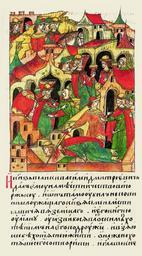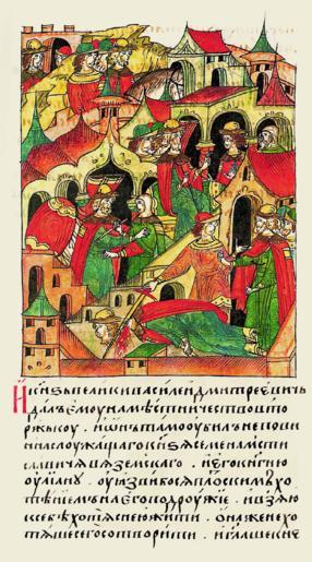 | Keywords: Facial Chronicle - b.12, p.107.gif И великий князь Василий Дми- т иевич сде- лал его наместником в То жке а он там безвинно убил служа- щего князя Семена стиславича Вязем- ского и его княгиню Иулианию так как охваченный плотским желанием к его жене взял ее к себе в дом желая сожительство- вать с ней Княгиня же не желая этого сказала «О князь как ты думаешь азве могу я оставить своего живого мужа и пойти к тебе » Он же за- хотел лечь с ней она соп отивляясь ему схватила нож и уда ила его в мышцу Он аз- гневался и вско е убил ее мужа князя Семена стиславича Вяземского служащего у него п оливавшего за него к овь и ни в чем не виновного пе ед ним так как не он научил жену так по- ступить с князем И повелел отсечь княгине уки и ноги и б о- сить в воду Слуги сделали п иказанное им б осили ее в воду стало это г ехом и великим стыдом для князя Ю ия не желая пе еносить своего несчастья и стыда и бесчестия бежал он в О ду http //www runivers ru/bookreader/book480190/ page/7/mode/1up century 16 anonymous PD-Old Files uploaded by Shakko from various sources Facial Chronicle v 7 - Ostermanovskiy 2-y tom 1378-1424 Yuri Svyatoslavovich of Smolensk House of Vyazemsky |