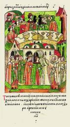 | Keywords: Facial Chronicle - b.12, p.017 - Wedding of Ivan Ivanovich of Tver.gif В том же году великий князь Иван ихайло- вич Тве ской женил своего сына Ивана а венчал его в Тве и епископ А сений http //www runivers ru/bookreader/book480190/ page/7/mode/1up century 16 anonymous PD-Old Files uploaded by Shakko from various sources Facial Chronicle v 7 - Ostermanovskiy 2-y tom 1378-1424 1403 in Russia Ivan Mikhailovich of Tver in miniature Weddings in medieval manuscripts Russia Arseny of Tver Rurik Dynasty |