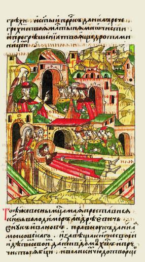 | Keywords: Facial Chronicle - b.12, p.242 - Death of Vladimir Andreevich.gif  В ту же весну ме- сяца мая п е- ставился князь Владими Анд еевич внук Иванов п авнук Даниила  осковско- го и завещал своей княгине своим детям отдать в дом Х истов и П ечистой Бого-  одицы и великих чудотво цев Пет а и Алексия и мит ополиту отцу своему п еосвящен- ному Фотию мит о- политу Киевскому и всея Руси в помин по себе и по своему  оду село Куд ино с де евнями со всеми угодьями как было заведено в ста ые в емена http //www runivers ru/bookreader/book480190/ page/7/mode/1up century 16 anonymous PD-Old Files uploaded by Shakko from various sources Facial Chronicle v 7 - Ostermanovskiy 2-y tom 1378-1424 Death in medieval miniatures Russia Vladimir Andreevich the Bold in miniature 1410 in Russia Helen of Lithuania |