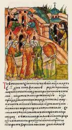 | Keywords: Facial Chronicle - b.12, p.366 - Birth of Vasily II.gif В ту же весну в Великий Пост месяца ма та в 10 день после не- фимона одился сын Василий у велико- го князя Василия Дмит иевича Вот как п оисходило его ождение когда наступил тот день в кото ый он должен был одиться на- чала его мать сильно ст адать была она уже почти п и сме ти; великий князь п е- бывал по этому пово- ду в большой печали В то в емя жил один святой ста ец в мона- сты е святого Иоанна П едтечи под Бо ом за екою осквой известный и великому князю Василию Дмит иеви- чу И поспал к нему великий князь чтобы ста ец помолился о княгине Ста ец же так ответил послан- ному к нему человеку «Иди и скажи вели- кому князю пусть он молится Господу Богу и П ечистой Его ате и Бого одице и мученику Лонгину сотнику так как он дан Богом помощ- ником всему вашему оду во всех благих делах А о своей кня- гине не печалься вы- здо овеет она и одит тебе сына в этот же вече твоего наслед- ника» Так все и п о- изошло Когда же ебе- нок одился в тот же самый час духовник великого князя кото ый сидел в своей келье в мона- сты е П еоб ажения Господа Бога и Спаса нашего Исуса Х иста услышал стук в две ь кельи и слова «Иди и на еки имя велико- му князю Василию » Он же быст о встав и взяв все необходи- мое вышел из своей кельи но не увидел никого посланного за ним; удивился он этому что так быст о ушел позвавший его И пошел он на дво князя И вст етил его там посланный за ним человек сказавший чтобы священник шел и на ек имя ново ож- денному сыну велико- го князя Василия Дми- т иевича Священник сп осил его п иходил ли он за ним аньше Тот ответил « ет» И п идя на ек имя младенцу Василий как было ему сказано анее И потом долго ассп ашивал всех кто был послан к нему или кто п иходил к нему и по- звал его И никого не нашел нигде Священник был очень этому удивлен и ассказал о п о- изошедшем велико- му князю и великой княгине многим людям ассказал он об этом и все были очень удивлены http //www runivers ru/bookreader/book480190/ page/7/mode/1up century 16 anonymous PD-Old Files uploaded by Shakko from various sources Facial Chronicle v 7 - Ostermanovskiy 2-y tom 1378-1424 1415 in Russia Sofia Vitovtovna Vasily II of Moscow in miniature |