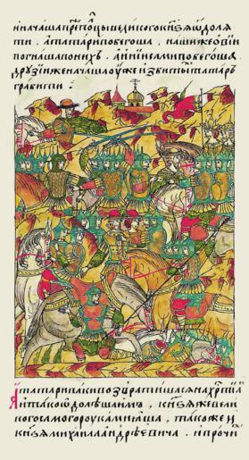 | Keywords: Facial Chronicle - b.14, p. 070 - Capture of Vasily II.gif но тата ы возв ати- лись и об ушились на х истиан и одолели их Самого великого князя пленили так же как и князя ихаила Ан- д еевича и остальных 7 июля 1445 года в с ажении у ок естностей Суздаля Василий II с объединенными усскими войсками поте пел по ажение от казанского войска под командованием казанских ца евичей ахмуда и Якуба сыновей хана Улу- ухаммеда в езультате сам Василий II и его двою одный б ат ихаил Ве ейский были взяты в плен http //www runivers ru/bookreader/book480451/ page/25/mode/1up century 16 anonymous PD-Old Facial Chronicle v 4 - Golytsinskiy tom 1114-1247; 1425-1472 Files uploaded by Shakko from various sources 1445 in Russia History of Suzdal Vasily II of Moscow in miniature Mikhail Andreevich of Vereya |