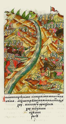 | Keywords: Facial Chronicle - b.16, p. 462 - Great standing on the Ugra.jpg  ru Стояние на Уг е 1480 г  иниатю а из Лицевого летописного свода XVI век «А наши ст елами и пищалми многих побиша а их ст елы межы наших падаху и никогож уязвляху и отбиша их от бе егу» en Standing on the Ugra river 1480 Miniature in Russian chronicle XVI century And our men had beaten many foes with arrows and muskets and their arrows had fallen between our men and had nobody hurting and had repelling them off the shore  Scanned from russian book Энциклопедия для детей - Исто ия России Аванта+ 2000 century 16 author PD-old-100-1923 Facial Chronicle v 8 - Shumilovskiy tom 1425; 1478-1533 Great standing on the Ugra River Pomestnoe vojsko |