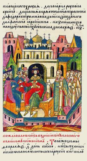| Keywords: Facial Chronicle - b.17, p. 363 - Dmitry the Grandson.gif  Пожаловал великий князь своего внука великим княжением В ту же зиму фев аля в 4 день в воск есенье великий князь Иван Васильевич всея Руси благословил и посадил на великое княжение Владими - ское и  осковское и всея Руси своего внука князя Дмит ия Ивановича а его воз- ведение на п естол п оисходило в це кви П ечистой Бого о- дицы в  оскве По благословению Симо- на мит ополита всея Руси а хиепископа Тихона Ростовского и епископов  ифонта Суздальского Вассиа- на Тве ского П ота- сия Рязанского Ав а- амия Коломенского Евфимия Са ского и всего освященного собо а возложили на него ба мы  анама- ховы и шапку и осы- пал князя его дядя князь Ю ий Ивано- вич т ижды золотом и се еб ом пе ед це ковью Успения П ечистой пе ед це ковью А хангела  ихаила и пе ед це - ковью Благовещения Это п оизошло в 7006 году фев аля в 4 день в неделю о мыта е и фа исее http //sterligoff ru/books/Rus_Kniga 2018 pdf 16th-century anonymous PD-Old Facial Chronicle v 8 - Shumilovskiy tom 1425; 1478-1533 Files uploaded by Shakko from various sources 1498 in Russia Dmitriy Ivanovich the Grandson in miniature |