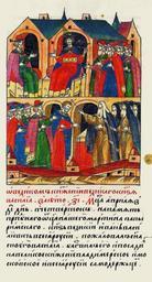 | Keywords: Facial Chronicle - b.17, p. 495.gif О великом княже- нии великого князя Василия В 7010 году месяца ап еля в 14 день в четве г на память п епо- добного отца нашего а тина папы Рим- ского великий князь Иван Васильевич всея Руси пожаловал своего сына Василия благо- словил его и посадил на великое княжение Владими ское и о- сковское и всея Руси самоде жцем 496 В ту же весну в мае в 1 день в воск есенье был поставлен на епи- скопию Коломенскую игумен икон из Пав- ловой пустыни по благословению Симона мит ополита всея Руси http //sterligoff ru/books/Rus_Kniga 2018 pdf 16th-century anonymous PD-Old Facial Chronicle v 8 - Shumilovskiy tom 1425; 1478-1533 Files uploaded by Shakko from various sources Ivan III of Russia in miniature Vasily III of Russia in miniature Simon Metropolitan of Moscow |