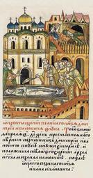 | Keywords: Facial Chronicle - b.18, p. 155 - Dmitriy Vnuk's death.jpg О кончине великого князя Дмит ия Ива- новича внука Той же зимой фев аля в 14 день п еставился благове ный великий князь Дмит ий Ива- нович внук в тю ьме и положили тело его в це кви а хангела ихаила в оскве возле отца его ве- ликого князя Ивана Ивановича http //sterligoff ru/books/Rus_Kniga 2018 pdf 16th-century anonymous PD-Old Facial Chronicle v 8 - Shumilovskiy tom 1425; 1478-1533 Death in medieval miniatures Russia Files uploaded by Shakko from various sources 1509 in Russia Dmitriy Ivanovich the Grandson in miniature |
