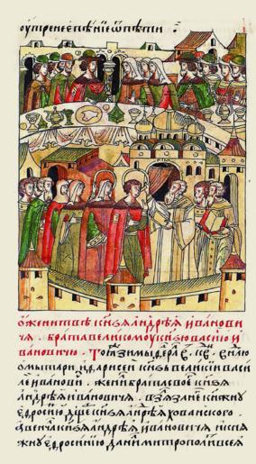 | Keywords: Facial Chronicle - b.19, p. 163 - Andrey of Staritsa's wedding.gif О женитьбе князя Ан- д ея Ивановича б ата великого князя Васи- лия Ивановича Той же зимой в фев але в 22 день в воск есе- нье о ыта е и Фа- исее великий князь Василий Иванович же- нил б ата своего кня- зя Анд ея Ивановича взял за него княжну Еф осинью дочь князя Анд ея Хованского; а венчал князя Анд ея Ивановича и княжну Еф осинью Даниил мит ополит всея Руси в собо ной це к- ви славного ца ствую- щего го ода осквы http //www runivers ru/bookreader/book481461/ page/31/mode/1up 16th-century anonymous PD-Old Facial Chronicle v 8 - Shumilovskiy tom 1425; 1478-1533 Files uploaded by Shakko from various sources 1533 in Russia Euphrosyne of Staritsk Andrey Ivanovich of Staritsa in miniature Daniil Metropolitan of Moscow Weddings in medieval manuscripts Russia |
