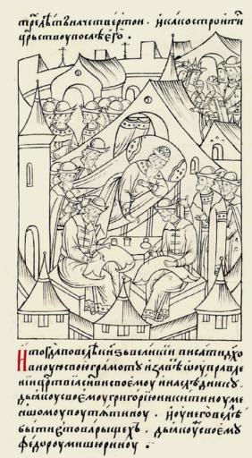 | Keywords: Facial Chronicle - b.19, p. 287 - Vasily III's writing his will.gif И тогда князь великий ду- ховную свою г амоту и завещание об уп авлении ца - ством сыну своему и наследнику повелел писать дьяку своему Г иго ию икитину еньшому Путятину и у него велел быть в това ищах дьяку же своему Федо у и- шу ину http //www runivers ru/bookreader/book481461/ page/31/mode/1up 16th-century anonymous PD-Old Facial Chronicle v 10 - Tsarstvennaya kniga 1533-1553 Death in medieval miniatures Russia Files uploaded by Shakko from various sources Vasily III of Russia in miniature House of Putiatin 1533 in Russia |
