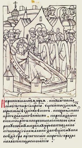 | Keywords: Facial Chronicle - b.19, p. 326 - Vasily III giving farewell to son Yuri.gif  И п инесли князя Ю ия и тут благо- словил сына своего Гео гия к естом ибо тогда князь Ю ий был очень мал одного года; и возложил на него к ест золотой Паисеинской и п и- казал отнести тот к ест после кончины своей боя ину своему  ихаилу Ю ьевичу; да и вотчиною его по- жаловал завещал ему в наследие го од Углич и п очие го ода и во- лости по достоянию http //www runivers ru/bookreader/book481461/ page/31/mode/1up 16th-century anonymous PD-Old Facial Chronicle v 10 - Tsarstvennaya kniga 1533-1553 Death in medieval miniatures Russia Files uploaded by Shakko from various sources Vasily III of Russia in miniature 1533 in Russia Elena Glinskaya Yuri of Uglich 1532-1563 in miniature |