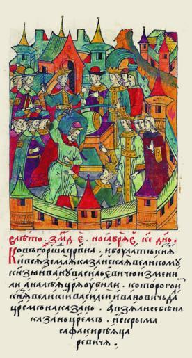| Keywords: Facial Chronicle - b.20, p. 004.gif иниатю а Лицевого летописного свода XVI в В 7044 году в нояб е в 25 день Ковго шад ца евна и Булат-князь и вся земля Казанская великому князю Ивану Васильевичу измени- ли ца я Яналея убили кото ого им князь великий Василий Ива- нович дал ца ем на Казань а взяли себе на Казань ца ем из К ыма ца евича Сафа- Ги ея» http //www runivers ru/bookreader/book482205/ page/43/mode/1up century 16 anonimus Facial Chronicle v 9 - Sinodalniy tom 1533-1542; 1553-1567 PD-Art 1535 in Russia |