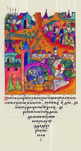 | Keywords: Facial Chronicle - b.20, p. 052.gif иниатю а Лицевого летописного свода XVI в И князь Анд ей тотчас побежал с княги- ней и с сыном в мае во 2 день; да от Ста- ицы отъехал ве ст с шестьдесят до Бе - новых сел овото ж- ского уезда» http //www runivers ru/bookreader/book481478/ page/52/mode/1up century 16 anonimus Facial Chronicle v 9 - Sinodalniy tom 1533-1542; 1553-1567 PD-Art Andrey Ivanovich of Staritsa in miniature Vladimir Andreevich of Staritsa in miniature Euphrosyne of Staritsk | ||||