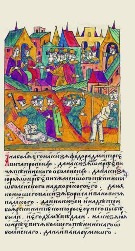 | Keywords: Facial Chronicle - b.20, p. 068.gif иниатю а Лицевого летописного свода XVI в А на боя его на князя Федо а Дмит иевича П онского да на князя Ивана Анд еевича Ле- нинского Оболенского да на князя Ю ия Анд еевича еньшого Пенинского Оболен- ского на дво ецкого его да на конюше- го на князя Бо иса Ивановича Палецкого да и на князей и на детей боя ских на тех кото ые у него в избе были и его думу знали на князя Ю ия Анд е- евича Большого Пе- нинского Оболенского да на Ивана Умного сына Ивана Лобано- ва Колычева да и на шу ина князя Анд ея на князя Ивана Ан- д еевича Хованского опалу свою положили велели их пытать да и казнить то говой казнью» http //www runivers ru/bookreader/book481478/ page/52/mode/1up century 16 anonimus Facial Chronicle v 9 - Sinodalniy tom 1533-1542; 1553-1567 PD-Art Andrey Ivanovich of Staritsa in miniature |