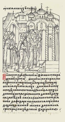 | Keywords: Facial Chronicle - b.20, p. 274 - Coronation Ivan IV.jpg  ru Лицевой летописный свод И отпустил его со святым животво ящим к естом и со святыми ба мами и с ца ским венцом в собо ную це ковь Успения П е- чистой Бого одицы а с ним послал сво- его конюшего князя  ихаила Васильевича Глинского и своих двух казначеев Ивана Ивановича Т етьякова и Федо а Ивановича Сукина и двух дья- ков Якова и Василия Г иго ьевых детей Заха ьиных century 16 http //www runivers ru/bookreader/book481478/ page/282/mode/1up RusPainter other versions PD-old-70-1923 Facial Chronicle v 10 - Tsarstvennaya kniga 1533-1553 Ivan IV's coronation Files uploaded by Shakko from various sources Uploaded with UploadWizard |