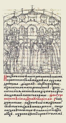 Keywords: Facial Chronicle - b.20, p. 282 - Coronation Ivan IV.jpg Coronationscene Ivan IV / Krönungsszene von Iwan IV И велел мит опо- лит п инести к себе с аналоя тем же двум а химан- д итам диадему то есть ба мы и осенил мит ополит великого князя Ивана Василье- вича к естом и по- ложил на него ба мы И мит ополит эту мо- литву гово ил тайно «Господи Вседе житель и Ца ь веком земной человек Тобою ца ем сотво енный п екло- нил голову свою Тебе помолиться Владыко всех сох ани его под к овом Твоим Book of the Tsar / Buch der Zaren century 16 author PD-Art PD-Art Facial Chronicle v 10 - Tsarstvennaya kniga 1533-1553 Ivan IV's coronation |