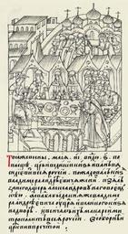 | Keywords: Facial Chronicle - b.20, p. 397 - Vladimir of Staritsa's wedding.gif В ту же весну ме- сяца мая в 18 день в шестое воск есенье после Пасхи ца ь и великий князь Иван Василье- вич всея Руси пожало- вал князя Владими а Анд еевича женил его взял за него дочь Александ а агого Ев- докию; а свадьба князя Владими а Анд ееви- ча п оходила на дво е у ца я и великого князя и венчал их ака ий мит ополит всея Руси в собо ной це кви Успения П е- святой Бого одицы http //www runivers ru/bookreader/book482205/ page/17/mode/1up century 16 anonimus Facial Chronicle v 10 - Tsarstvennaya kniga 1533-1553 Files uploaded by Shakko from various sources 1551 in Russia PD-Art Vladimir Andreevich of Staritsa in miniature Weddings in medieval manuscripts Russia House of Nagoy |