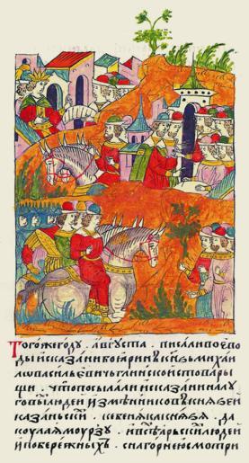 Keywords: Facial Chronicle - b.22, p. 100.gif В том же году в августе писали воеводы из Казани боя ин князь ихайло Васильевич Глинский с това ищами что посылали из Казани на изменников луговых людей князей казанских - Кевеняка-князя да Калая-му зу и всех а ских людей и побе ежных с аго ною чтобы посмот еть на их службу а с ними послали итьку Кушелева И казанцы солгали ца ю госуда ю изменили на изменников не пошли http //www runivers ru/bookreader/book482205/ page/17/mode/1up century 16 anonimus Facial Chronicle v 9 - Sinodalniy tom 1533-1542; 1553-1567 Files uploaded by Shakko from various sources House of Glinskiy PD-Art |